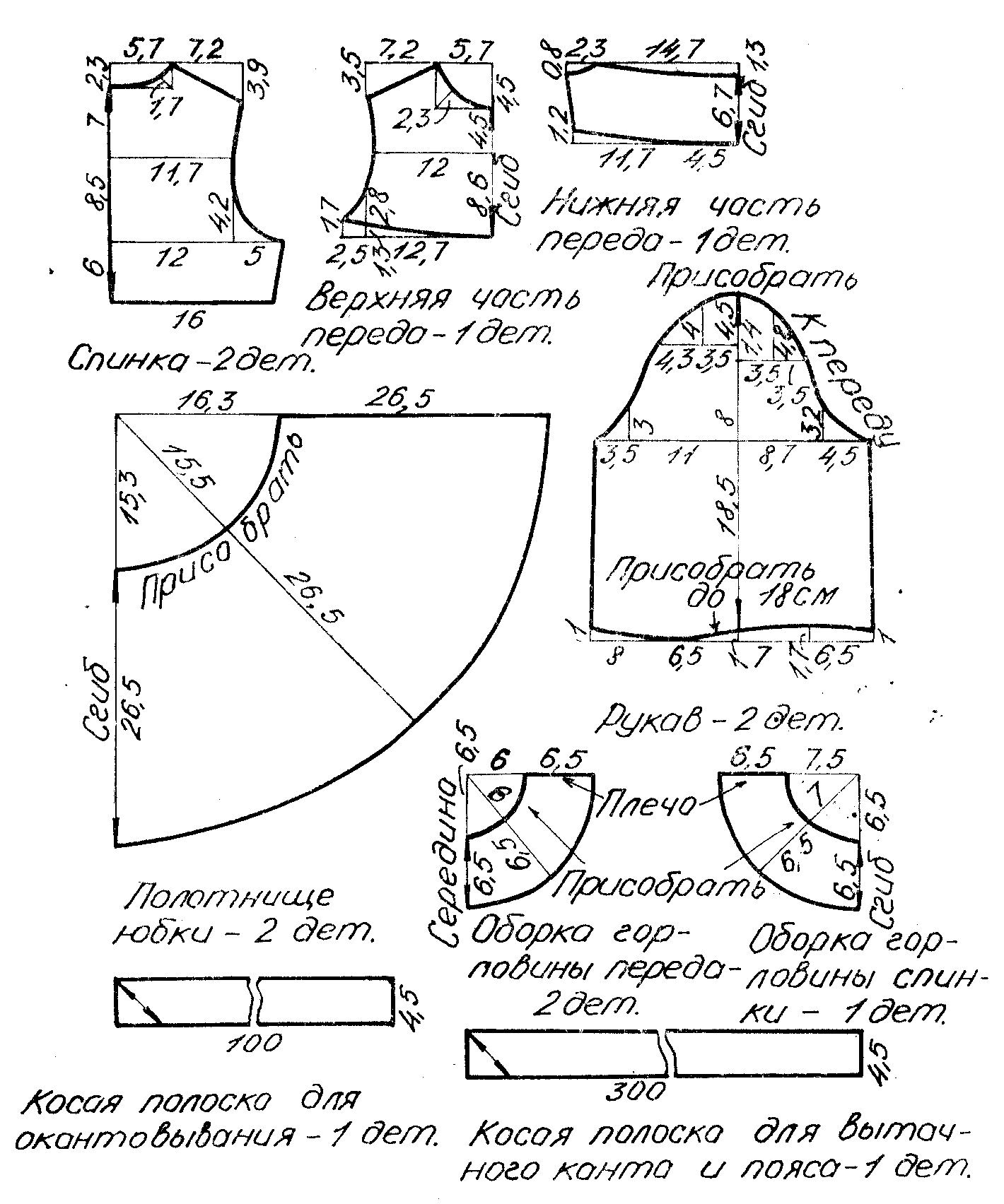 Крой изделия складывается из двух деталей центральной части спинки, одной складчатой детали центральной полочки, четырех боковых деталей (двух – для полочки и двух – для спинки), а также пары юбочных частей. Понадобятся шесть цельнокроеных обтачек (для горлового выреза и пройм) из основной материи и флизелина.