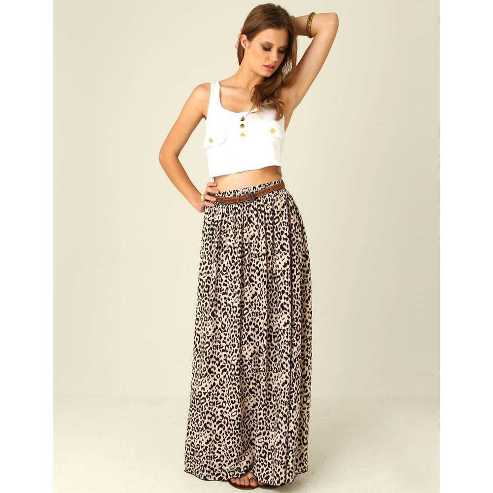 Длинная леопардовая юбка органично смотрится с простым и лаконичным верхом, к примеру, насыщенно-коричневой трикотажной майкой, такой же шляпой и сумкой. Не стоит перегружать образ украшениями – тогда он будет легким, соблазнительным, воздушным. Можно в качестве верха использовать черную майку без изысков и тонкий поясок.