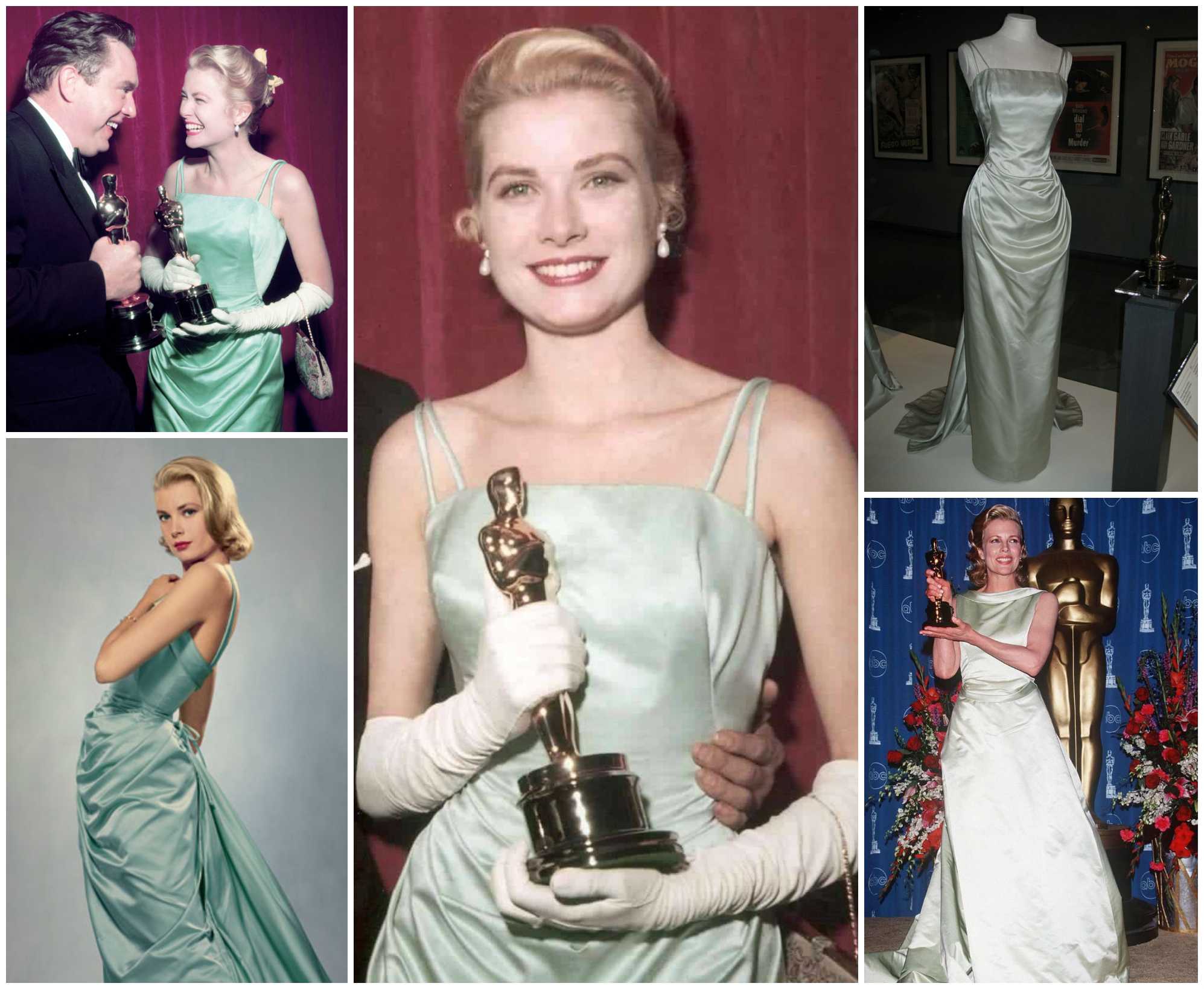В 1955 году Грейс Келли вручили премию «Оскар» за «Деревенскую девушку». Возможно, Грейс — не самая выдающаяся актриса в истории Голливуда и справедливее в тот год было отметить заслуги блистательной Джуди Гарланд за ее бенефисную роль в «Звезда родилась». Но если фильм «Деревенская девушка» не оставил особого следа в истории кино, то платье Грейс, в котором она, пусть и не совсем заслуженно, получила свой «Оскар», навсегда вошло в историю моды. Эдит Хэд, придумавшая канонические наряды для актрисы в фильмах Хичкока «Окно во двор» и «Поймать вора», создала для Грейс платье, которое по праву стало эталонным оскаровским нарядом, символом правильного голливудского гламура. Выполненное из сатина платье отличал достаточно простой крой: классический силуэт, легкая драпировка на бедрах. Главной изюминкой наряда стал его сложный голубовато-мятный цвет. Этот красивый ледяной оттенок отлично подчеркивал аристократически холодную красоту Грейс. Свой элегантный образ Келли дополнила высокими белыми перчатками. Многие актрисы ориентировались на Грейс при выборе наряда для красной дорожки. Вспомним хотя бы Ким Бейсингер, которая в похожем платье Escada, вышла на сцену получать «Оскар» за лучшую женскую роль второго плана в «Секретах Лос-Анджелеса» в 1998 году.