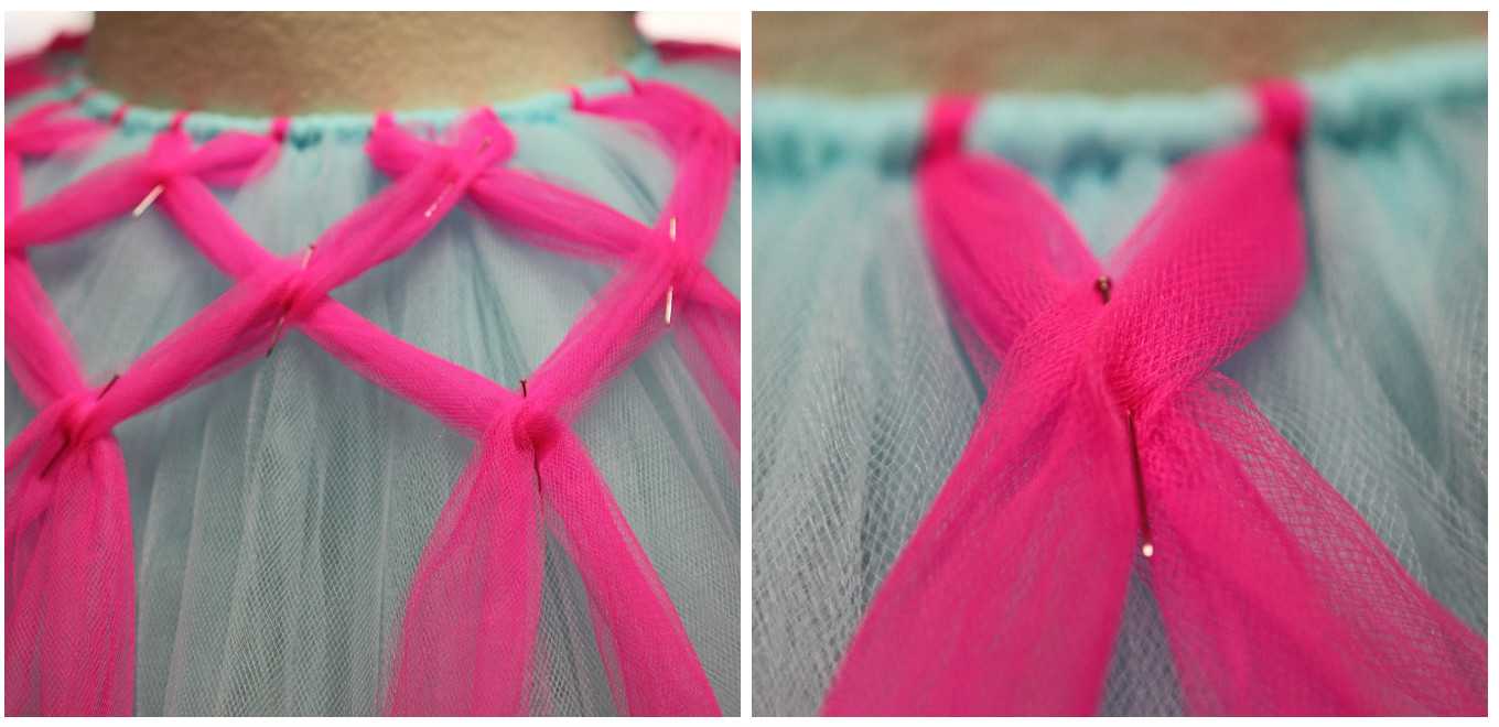 Начните надевать фатин на топ, но только не в первом ряду, как мы это делали в предыдущем мастер-классе, а во вторую строчку.