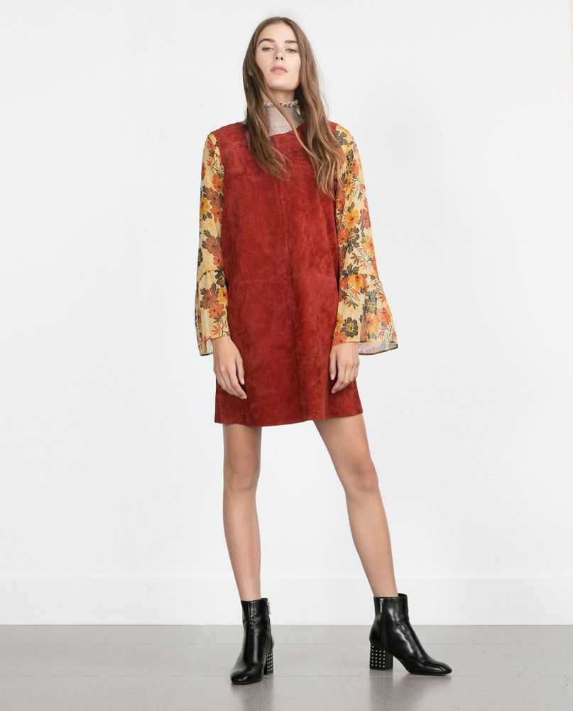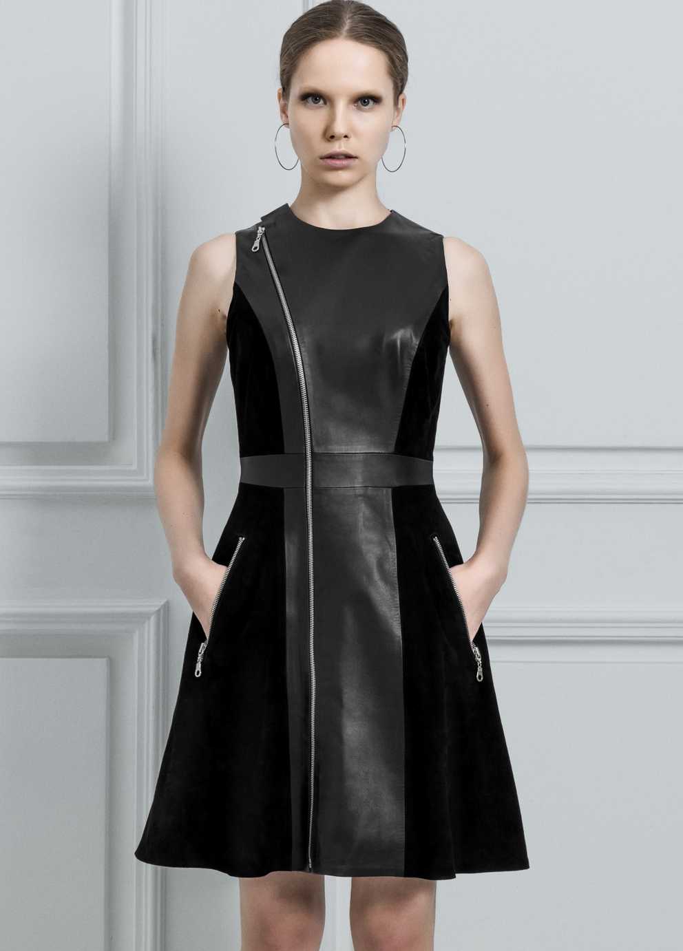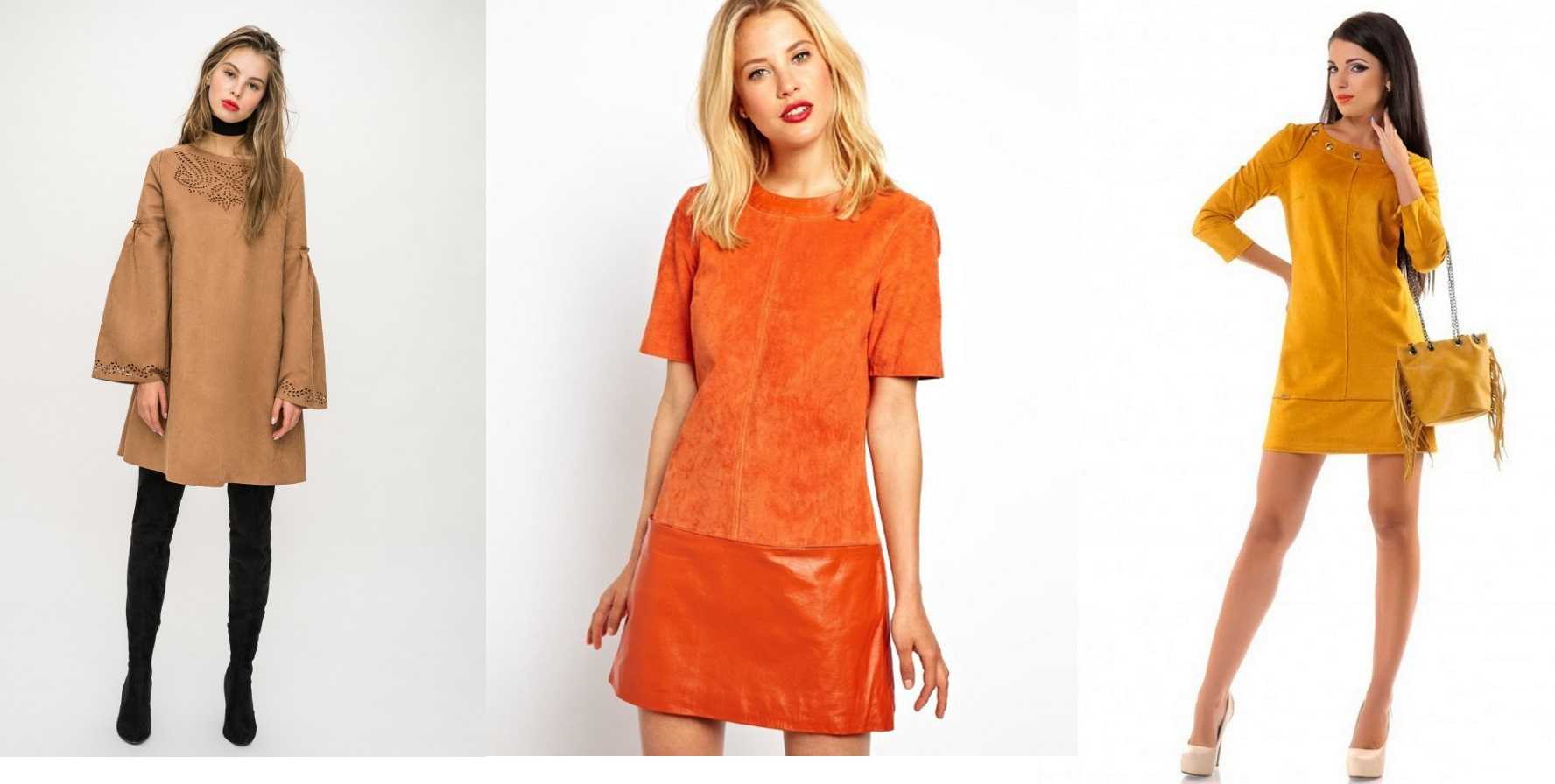 Стильной обновкой в этом сезоне окажется замшевая вещь в сочетании с кожаными вставками. Кожаные элементы могут повторять цвет замши, быть на несколько тонов темнее или светлее нее. Современные дизайнеры предпочитают воплощать такие комбинации в моделях длины мини. Чтобы образ приобрел эффектность, его нужно дополнить яркими оттенками. Актуальным решением будет платье с коричневой замшей, а также с оттенками оранжевого, желтого, зеленого.