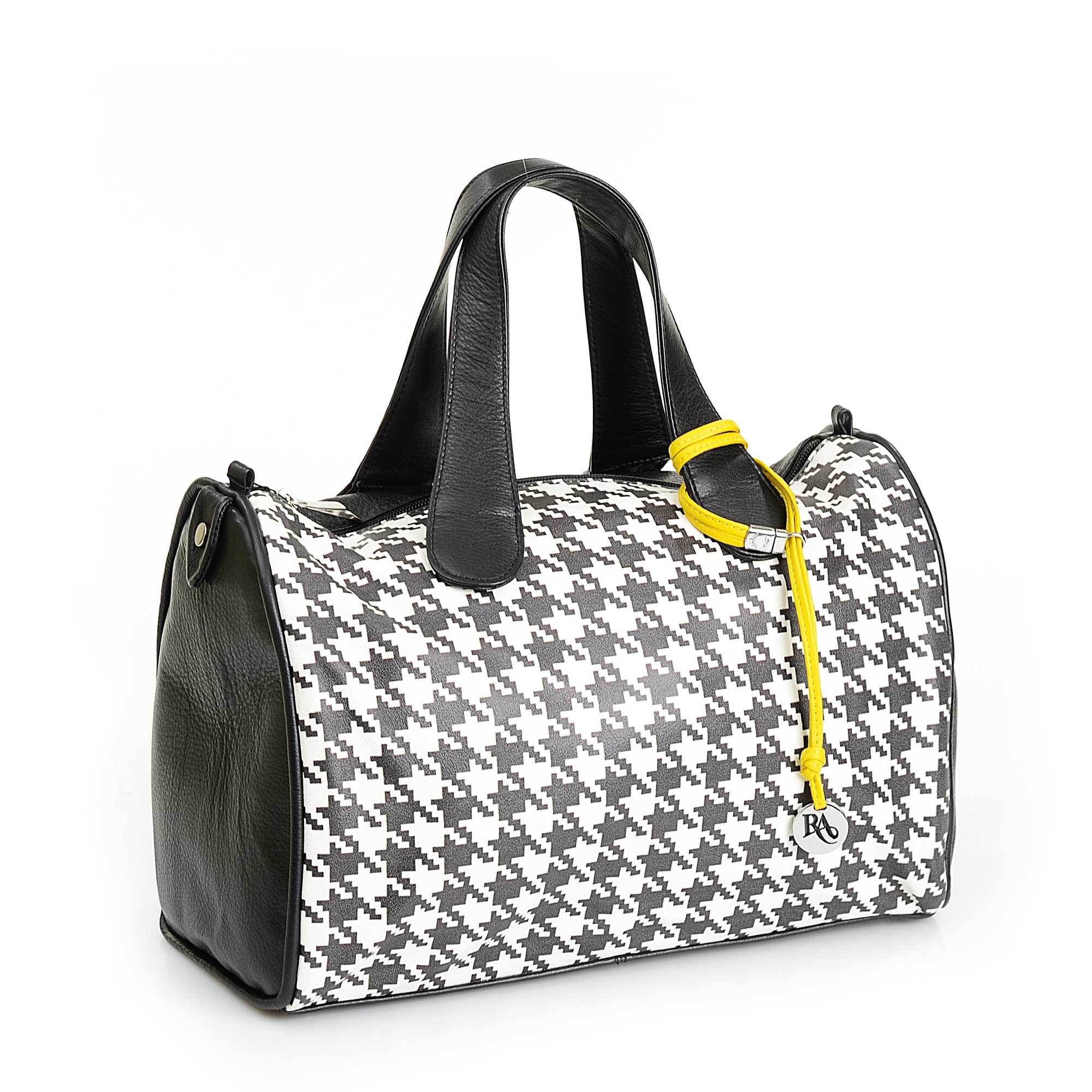 В последние годы стали очень популярны сумки с интересными принтами. «Гусиная лапка» не осталась в стороне, поэтому модницы могут пополнить коллекцию дизайнерских сумок и этим вариантом. В магазинах можно встретить и сдержанные черные сумки из кожи с шерстяной обивкой с принтом, и полностью стилизованные варианты.