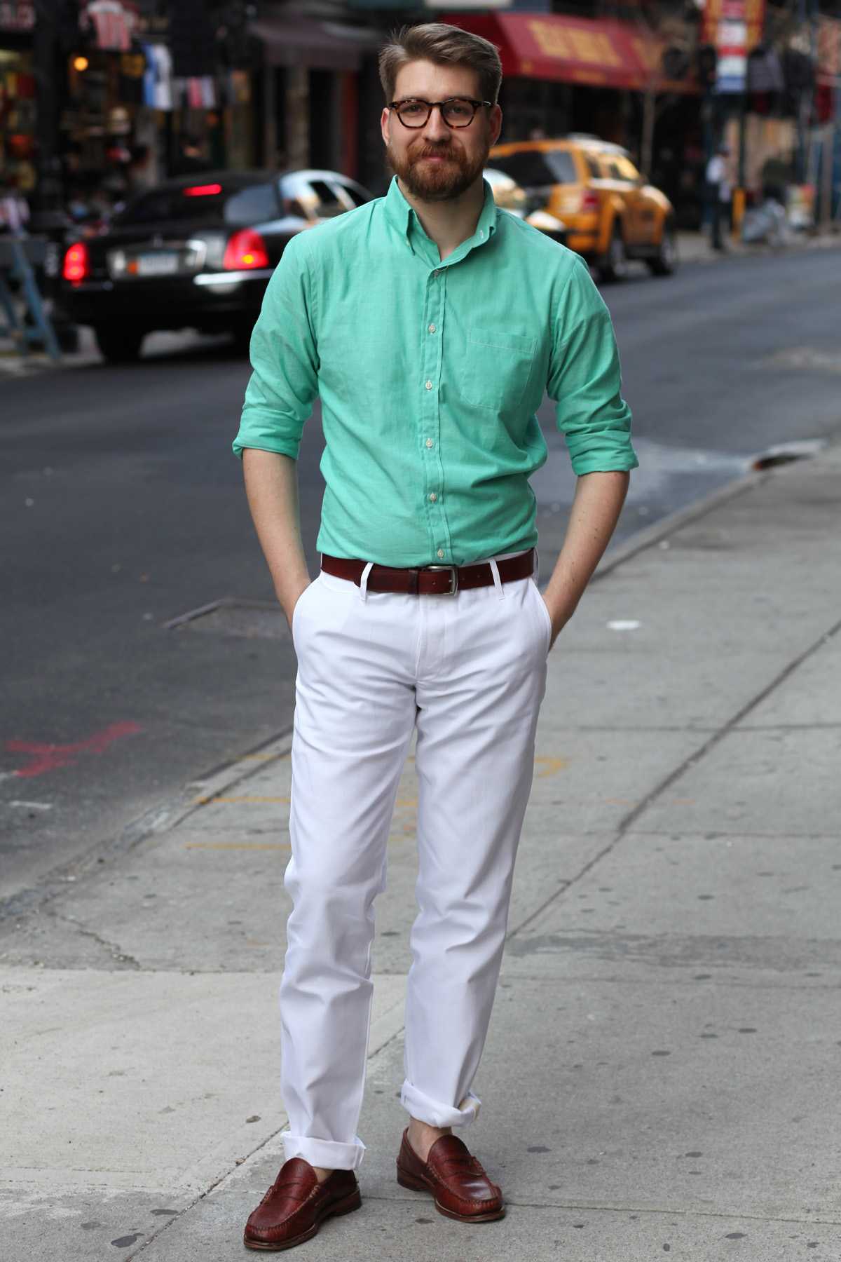 - С какими штанами подойдет: немного приталенные джинсы или джинсы с кромкой (selvedge denim). Я бы не стал подворачивать чиносы с широкой манжетой.