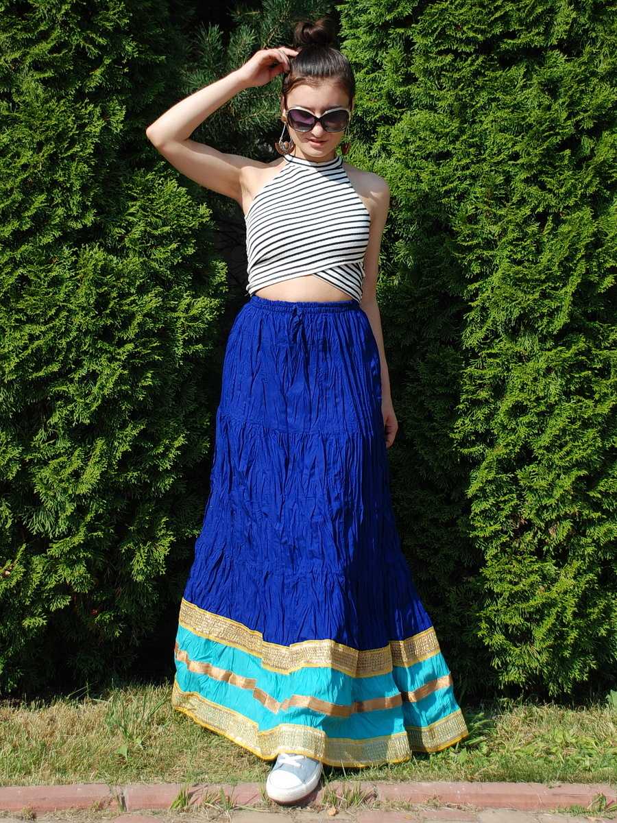 - Длинная. Летом наиболее популярны длинные шифоновые юбки на резинке. Они не сковывают движений, добавляют фигуре женственности и таинственности. Особенно актуальны модели на широком поясе. Этот вариант остается на пике популярности уже несколько сезонов, подойдет обладательницам пышных форм, а также хрупким девушкам.