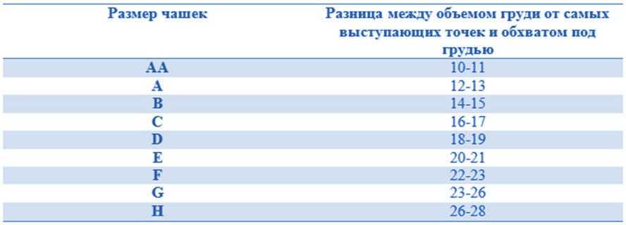 Таблица 2. Чашечки и разница между обхватами груди