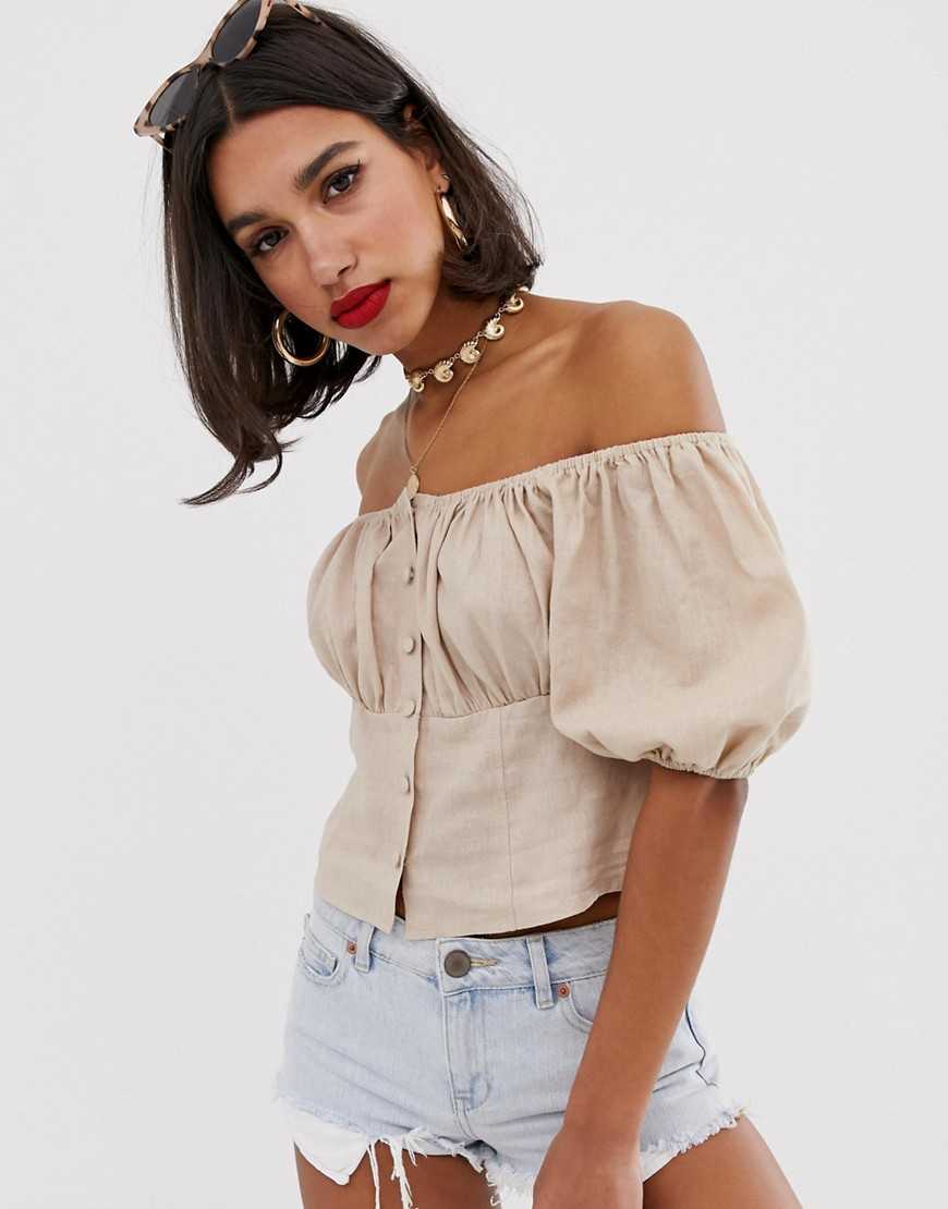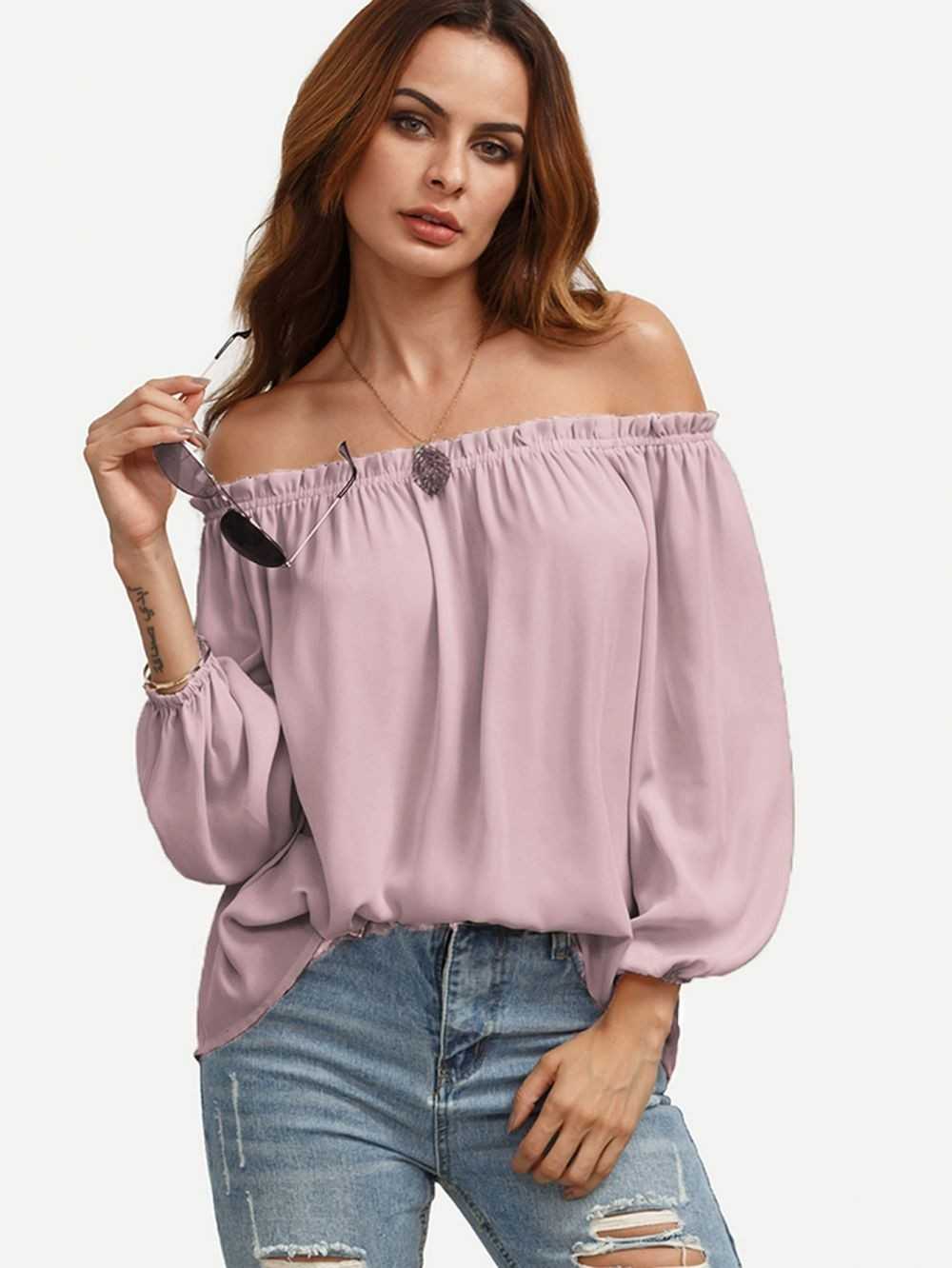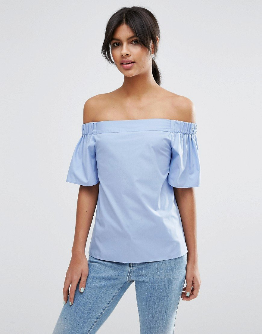 Фасон off-shoulder хорошо сочетается с расклешенными юбками в пол, джинсовыми шортами. Необычный лук получится из блузки с открытыми плечами и кожаным комбинезоном. Дополнить образ можно туфлями на высоком каблуке.