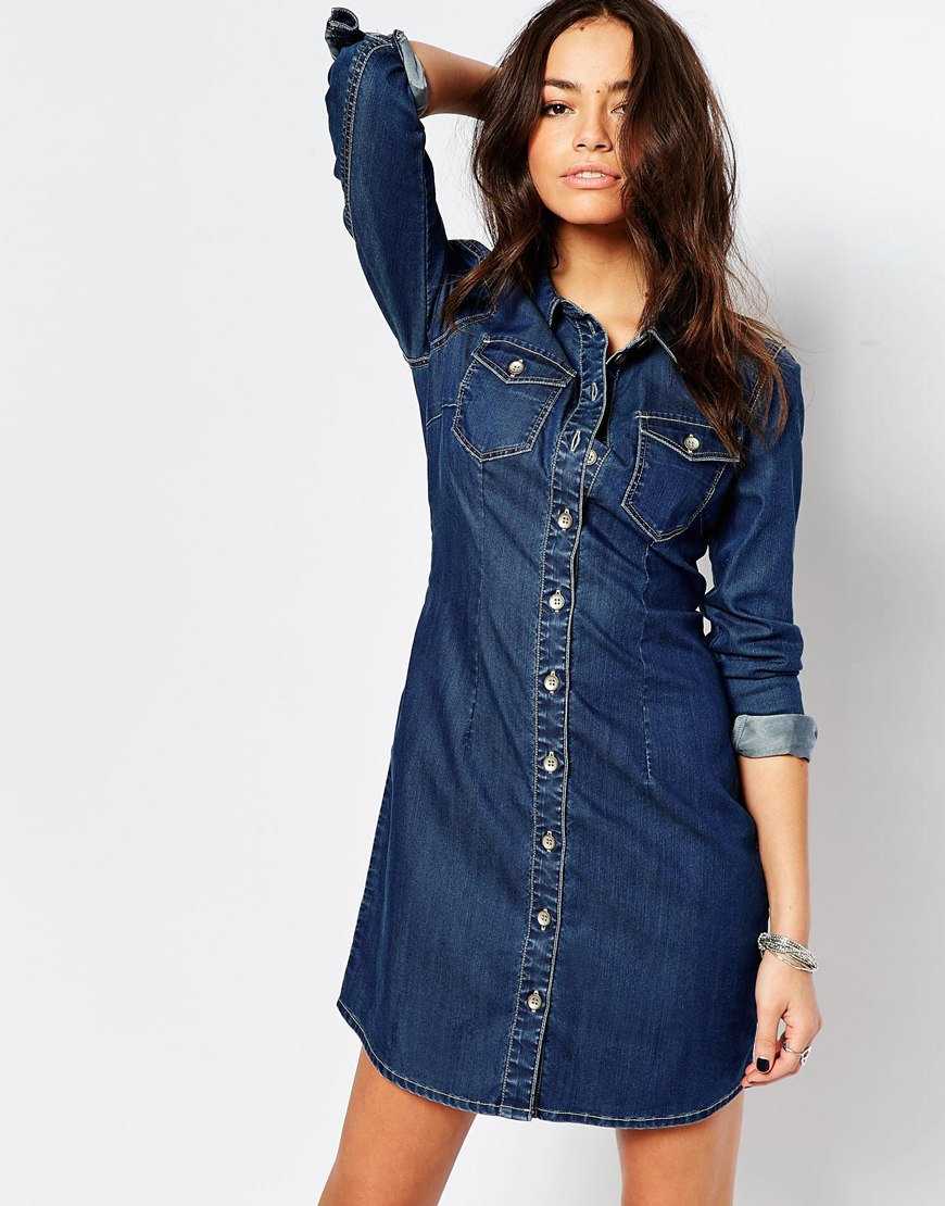 Темно-синее и черное джинсовое платье остается неизменным атрибутом рабочей обстановки и офисного дресс-кода. Не стоит обвинять данные модели в мрачности, с подобающими аксессуарами они способны затмить менее универсальные и удобные предметы женской одежды.