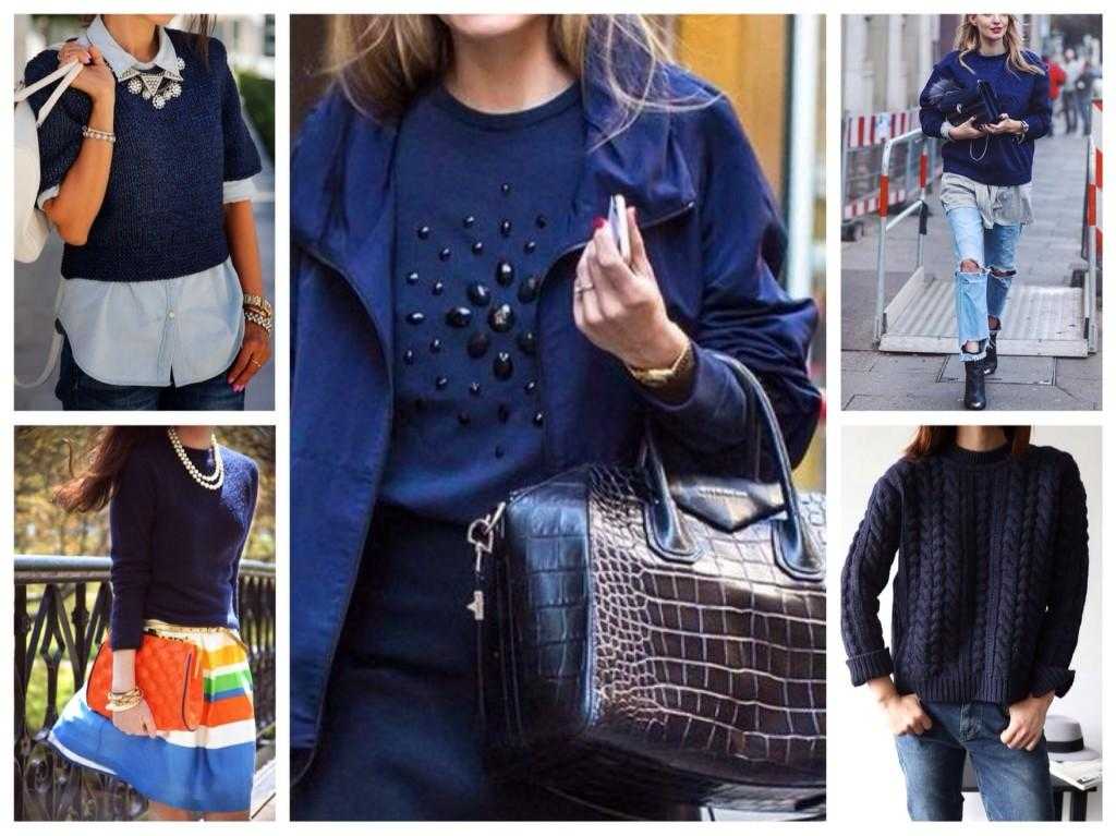 По тому же принципу стоит сочетать синий свитер с остальными элементами гардероба. Теплые комплекты уместны в прохладную погоду. Добавление белого и красного создаст морской стиль, навевающий мысли о лете. Неяркие комбинации с вещами коричневого или бежевого цветов уместны в повседневной жизни, в том числе и в офисе. Гармонично смотрится нейтральный жакет. Украсит ансамбль и розовый, сделав лук более романтичным. Особенно если это будет короткая воздушная юбка.