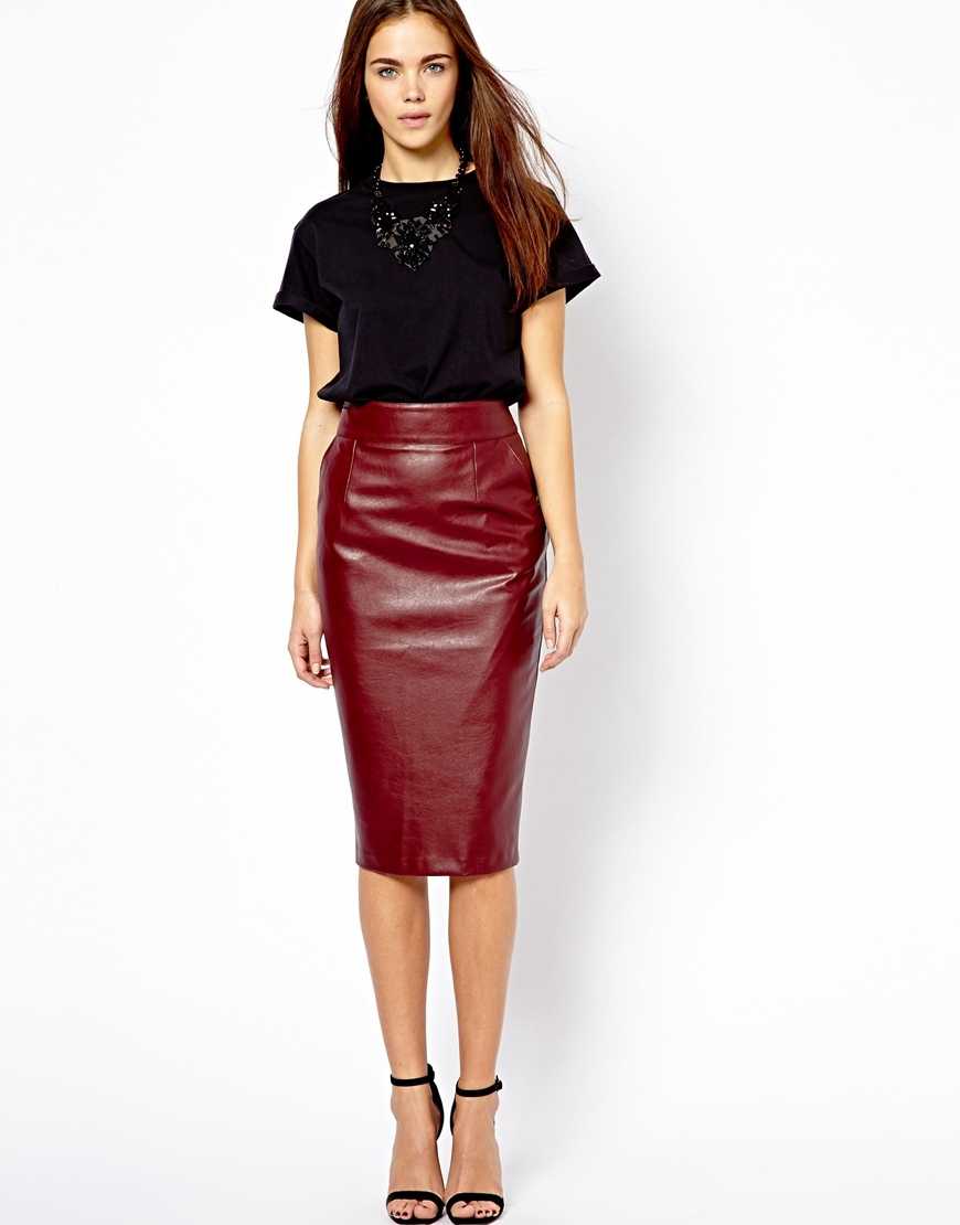 Ключевое правило модного образа с утонченной юбкой-карандаш из кожи заключается в комбинировании ее с верхом нейтральных оттенков простого кроя. Акценты можно расставить с помощью аксессуаров – объемных браслетов, сумок ярких оттенков или необычных подвесок.