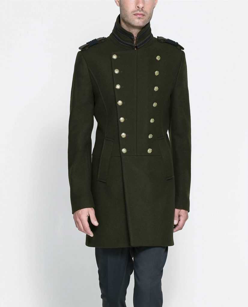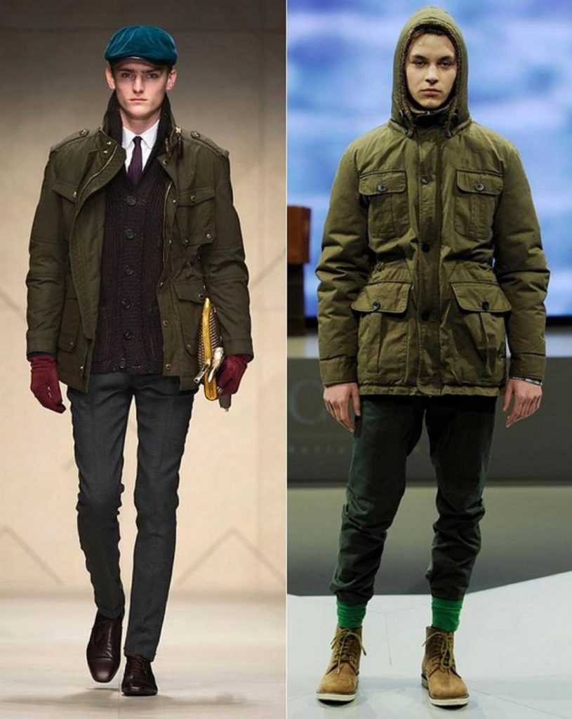 К основным элементам верхней одежды стиля милитари для мужчин относят: пальто-китель или бушлат, тренчкот, бомбер или куртка летчика.