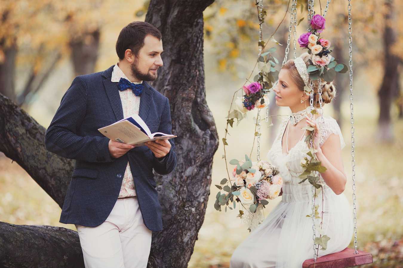 Костюм жениха и платье невесты должны быть очень простыми и элегантными. Никакой роскоши, бус и страз, никаких пышных юбок и галстуков, – чем проще будет наряд, тем больше он будет соответствовать духу и стилю свадьбы.