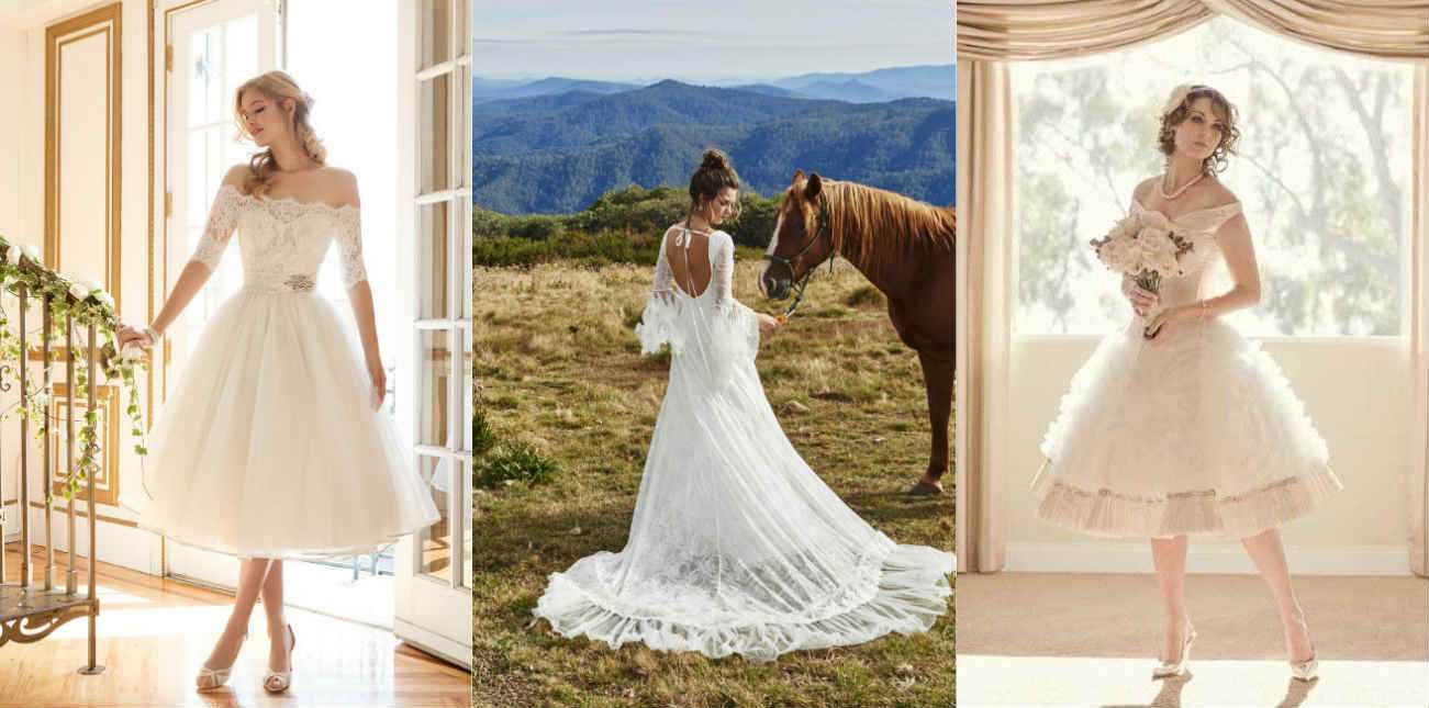 Старинные платья, но в современном исполнении – это стиль винтаж. Длина варьируется. Свадебные наряды чаще всего имеют низкую талию, в таких случаях юбка расширяется примерно на высоте колен.