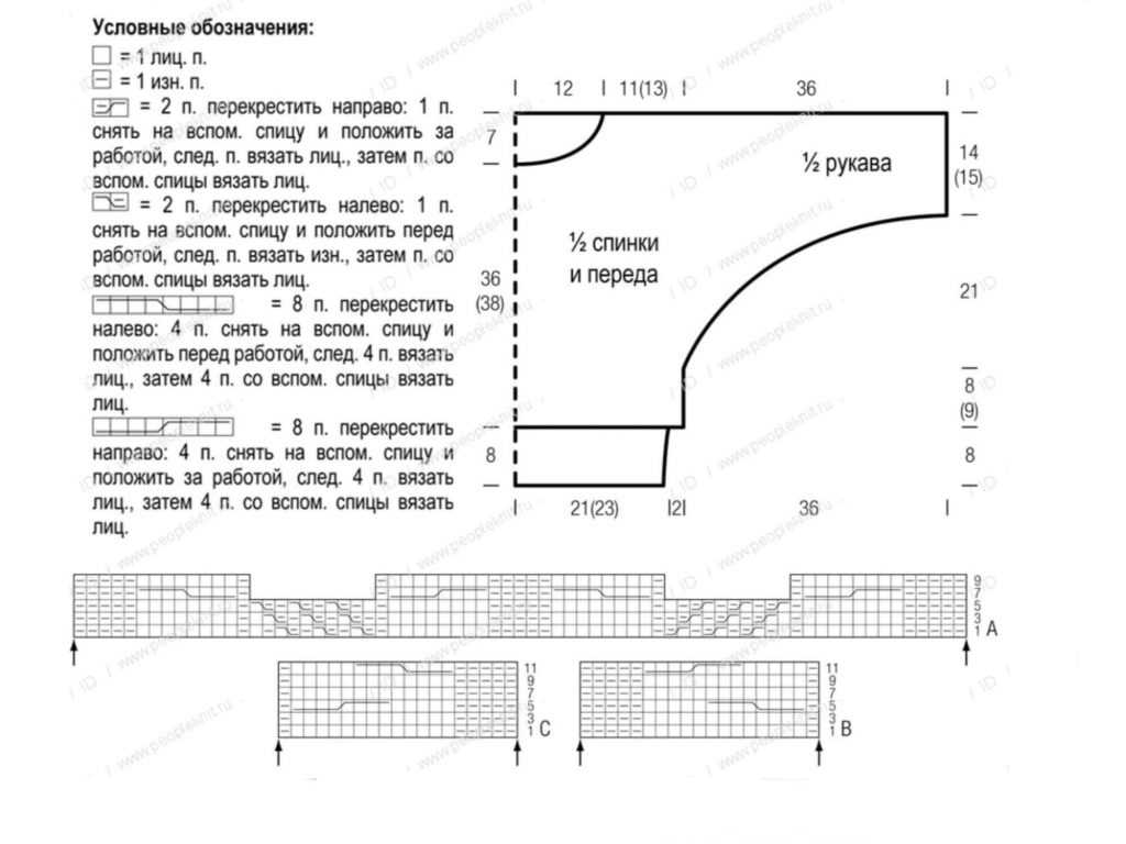 67-й р: без прибавок. 68-й р: кром, 1 лиц. прибавка, вязать до конца лиц. гл. и узором А, в конце 1 лиц. прибавка и кром. 192 (198) п. 69-й: начинаем узор на рукавах. Кром. п, 11 п. лиц. глади, 19 п. узора с косами В для рукавов, до узора А вяжем лиц. гл. Далее, вяжем симметрично началу р., 19 п. узор С для рукавов. Так мы вяжем ещё 30 (33 р.) – 14 (15) см.