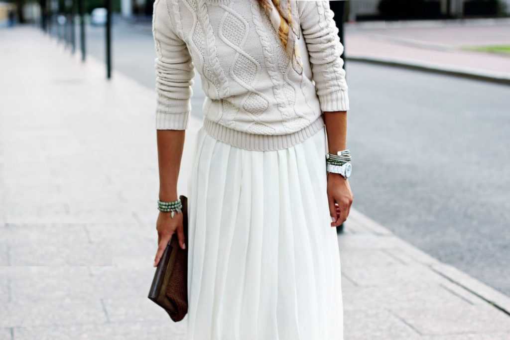 Не каждая вязаная вещь хорошо смотрится с такой юбкой — если комбинировать со слишком тонким свитером, низ будет визуально утяжелен, тогда уж лучше водолазка. А если что-то объемное в силуэте оверсайз, то вязка должна быть крупнее, а само изделие большей плотности.