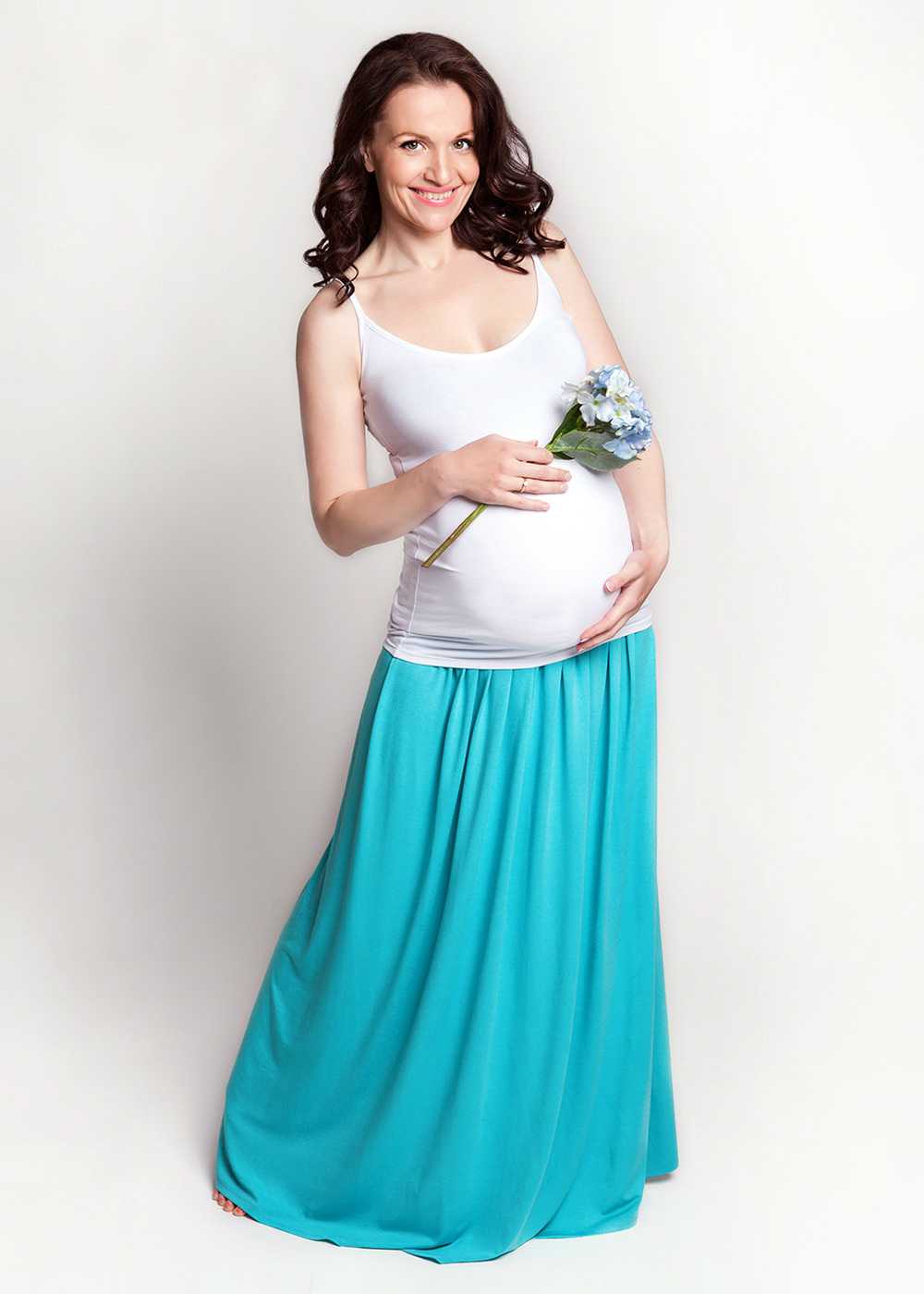 Женщинам в интересном положении расклешенная юбка подходит идеально. Она скроет выпирающий живот. Ее шьют из легких тканей. Можно выбрать длину ниже колена или до пола.