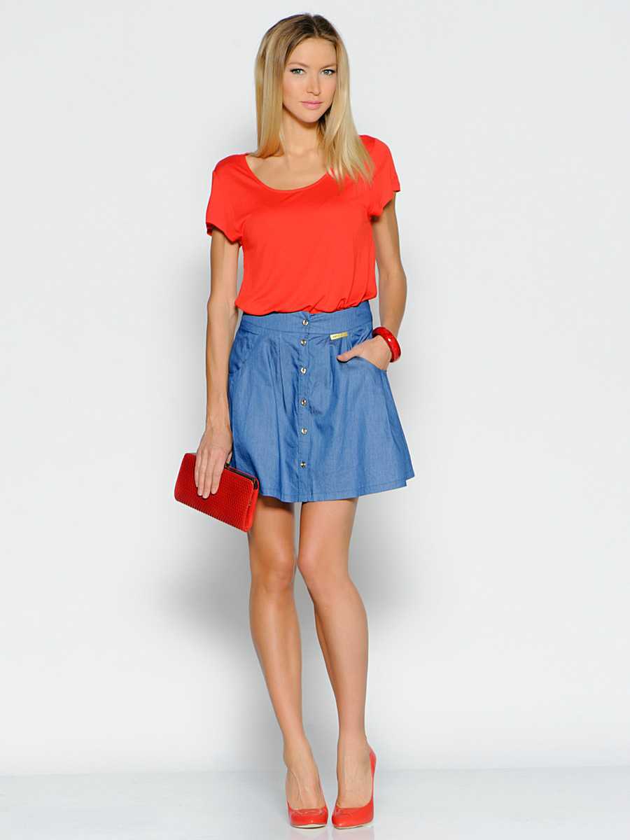 Синяя юбка отлично сочетается с верхом белого, жёлтого, зелёного или чёрного цвета. Отличным дополнением образа может стать футболка или кофта в горизонтальную полоску.