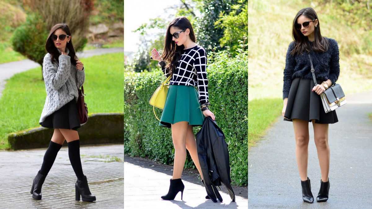 Завышенные короткие юбки в 2019 году довольно опасны в подборе вещей-компаньонов. В такой одежде вы рискуете выглядеть нелепо, создается впечатление, что вы натянули юбку слишком высоко. Лучше всего подобное изделие смотрится в комплекте с легинсами и трикотажной футболкой. Можно приспособить блузу с рукавами-фонариками или воротником-бантом – отличный выбор для красоток с фигурой «груша». Пояс подчеркнет тонкую талию, а объемные элементы на топе уравновесят широкие бедра. Не стоит носить мини с высокими каблуками – небольшой танкетки будет вполне достаточно, а шпильки 8-10 см можно надеть к юбочке длиной до колена – оптимальное сочетание.