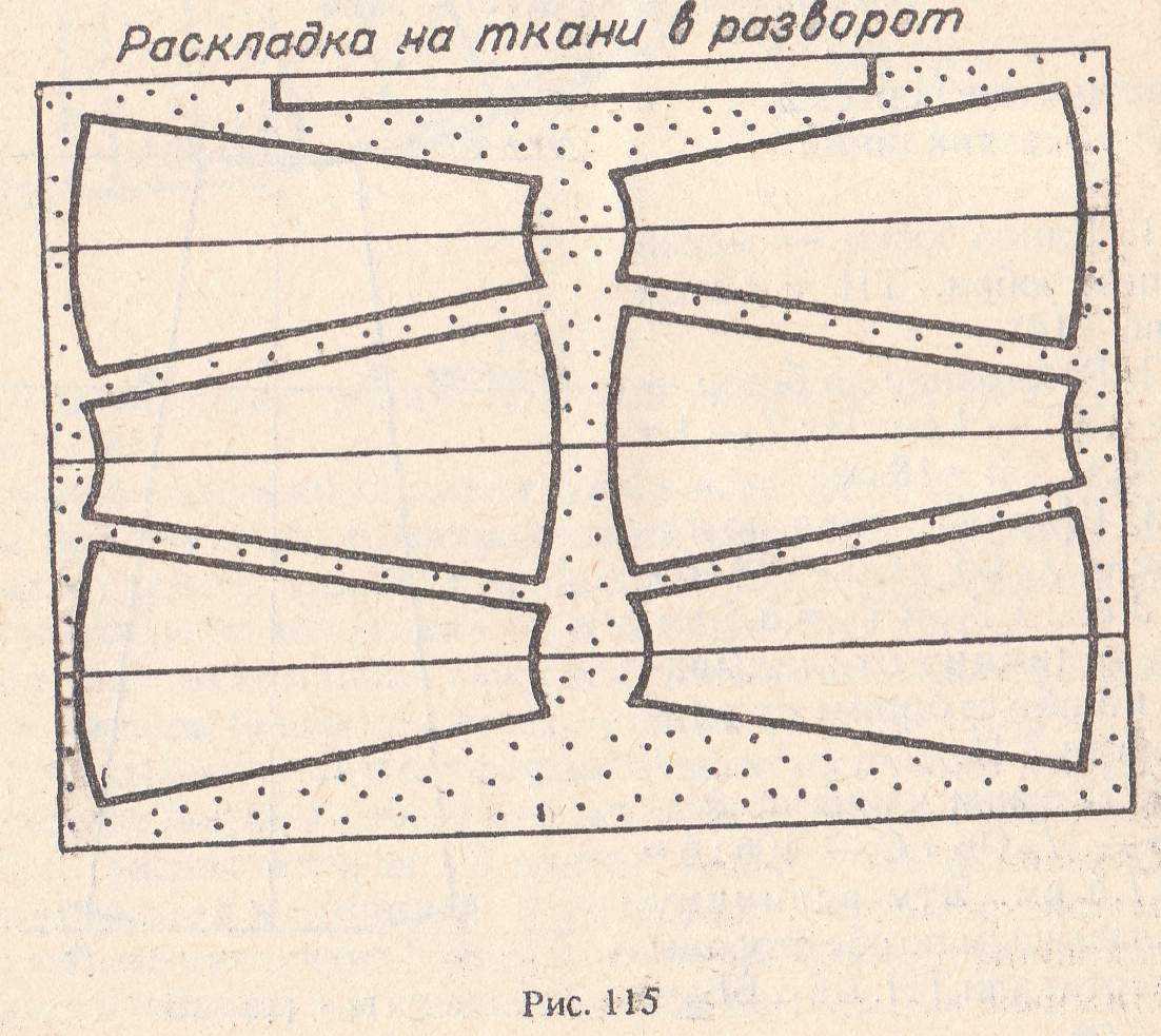 Ворс должен быть направлен сверху вниз. Если же ткань однотонная и гладкая, то клинья можно выкладывать на ткани поочередно: деталь талией вверх, деталь талией вниз. Это позволит сэкономить материал и использовать его разумно. Из оставшегося отрезка можно будет выкроить пояс или обтачку.