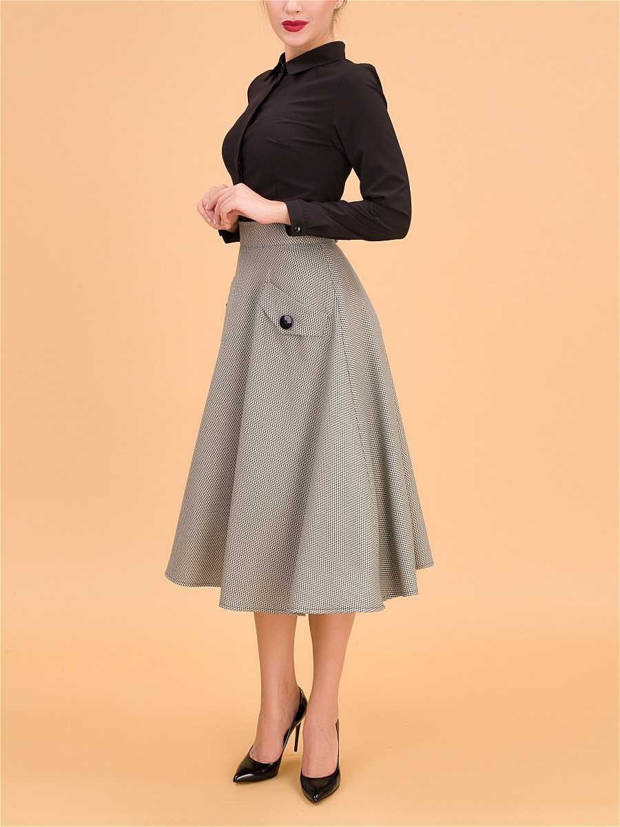 С таким верхом черная юбка смотрится великолепно. Клетка сейчас – в модных тенденциях 2019, и образ будет максимально стильным. Можно взять красно-черную клетку, красно-белую или многоцветную.