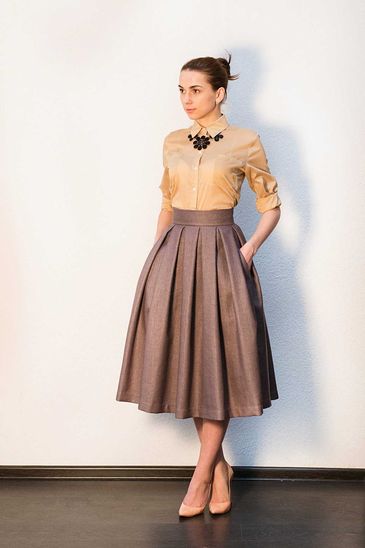 С чем сочетать бежевую атласную юбку — фото галерея