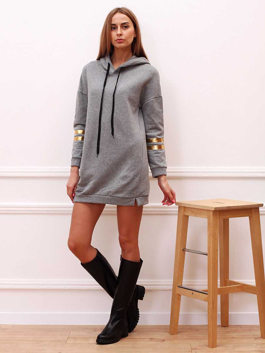 Платье с капюшоном выглядит свежо и оригинально. Такой фасон стоит сочетать с похожими спортивными вещами: кедами, модными сегодня большими кроссовками, джинсами-скинни или брюками с лампасами. Другой вариант — более женственный: рекомендуем комбинировать одежду с кожаной курткой-авиатором и высокими сапогами с широким голенищем.