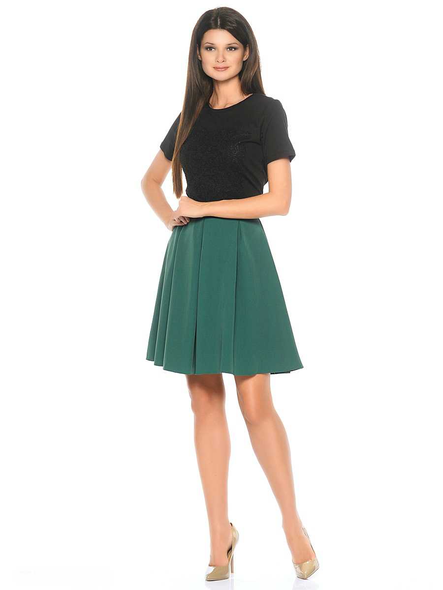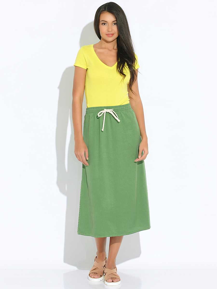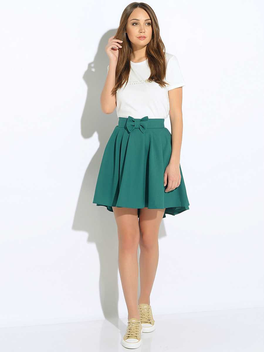 Летом зеленые юбки также любимы девушками. Короткая пышная юбка подойдет озорным девушкам, желающим показать свои прекрасные ноги. Такую юбку интересно будет надеть с футболкой с кричащей надписью или рисунком. К такому образу идеально подойдут кроссовки или босоножки.