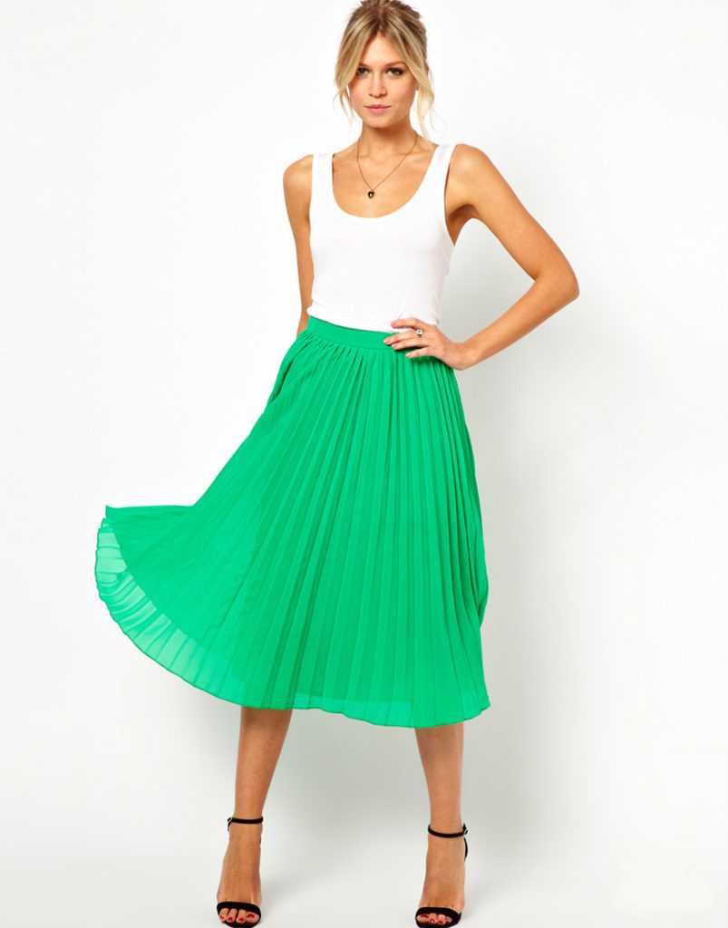 Зеленая миди из плиссированной ткани может создать элегантный деловой лук в сочетании с белоснежной блузой.