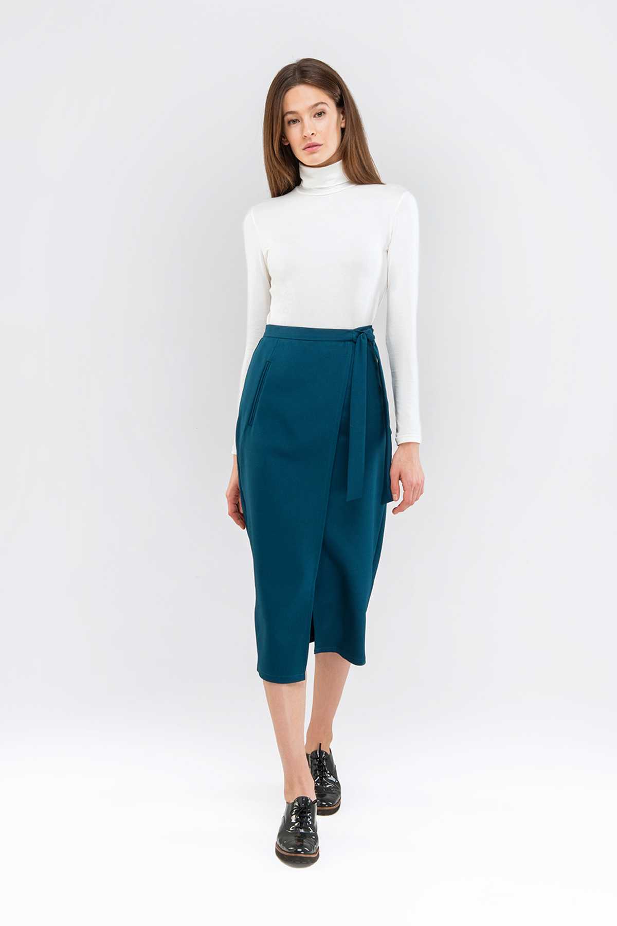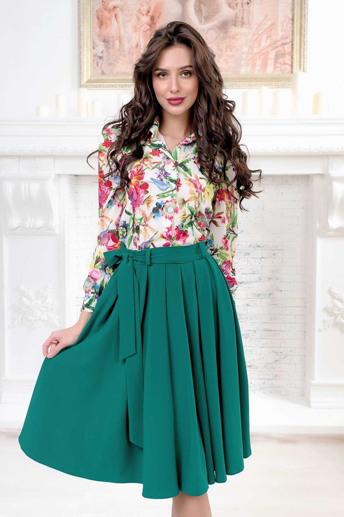 Темно-зеленая модель удачно комбинируется с белоснежной блузой, светло-зеленый оттенок юбок можно сочетать с пастельными персиковым, бежевым оттенками. Если дресс-код мероприятия позволяет, то возможна комбинация юбки зеленого цвета с блузами с геометрическим узором в приглушенных тонах.