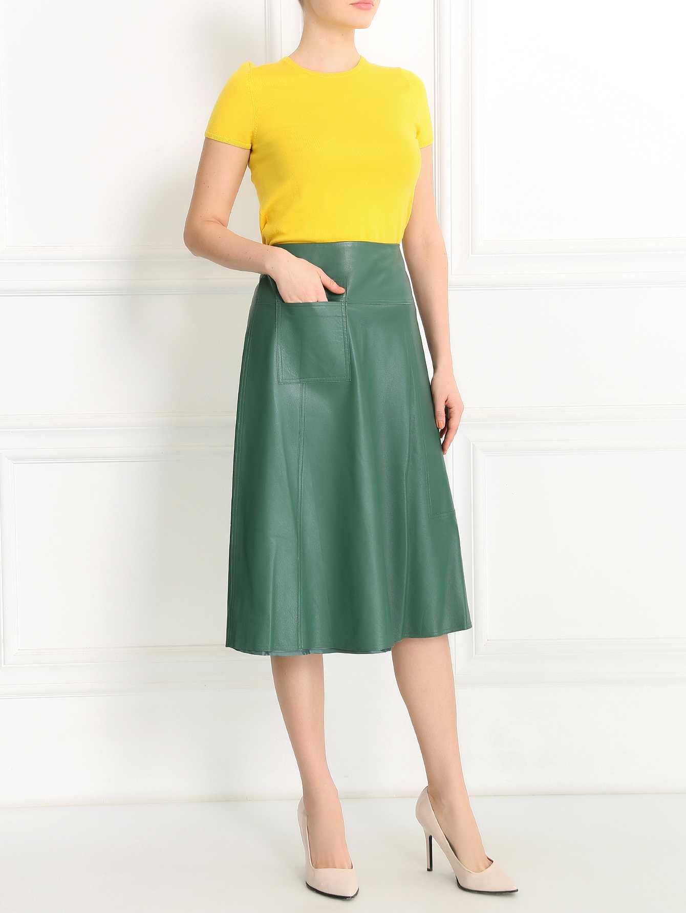 Зеленую кожаную юбку надевают креативные дамы, имеющие неординарное чувство стиля.