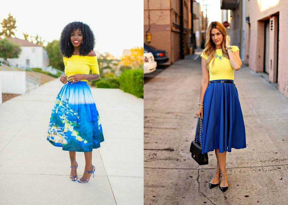 Лучше выбирать светлые тона желтой блузки, если вы одели синюю юбку или брюки. Два ярких цвета создают излишнюю контрастность.