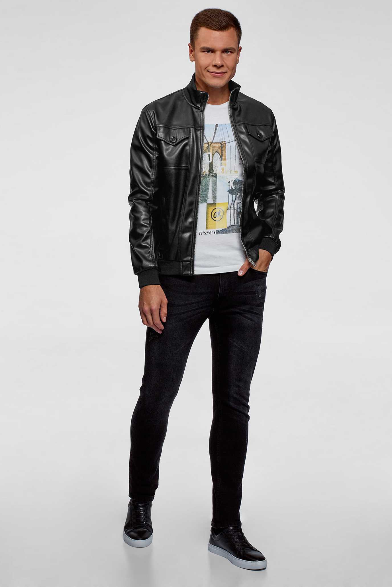 Бомбер и брюки-чинос или джинсы – идеальный вариант для повседневного образа. Для верха подойдет рубашка, футболка или тонкий свитер. Сочетается кожаный бомбер с такой обувью, как кроссовки, лоферы, мокасины, а также конверсы. В прохладную погоду стильная однотонная бейсболка дополнит молодежный образ.