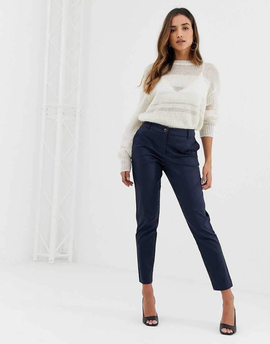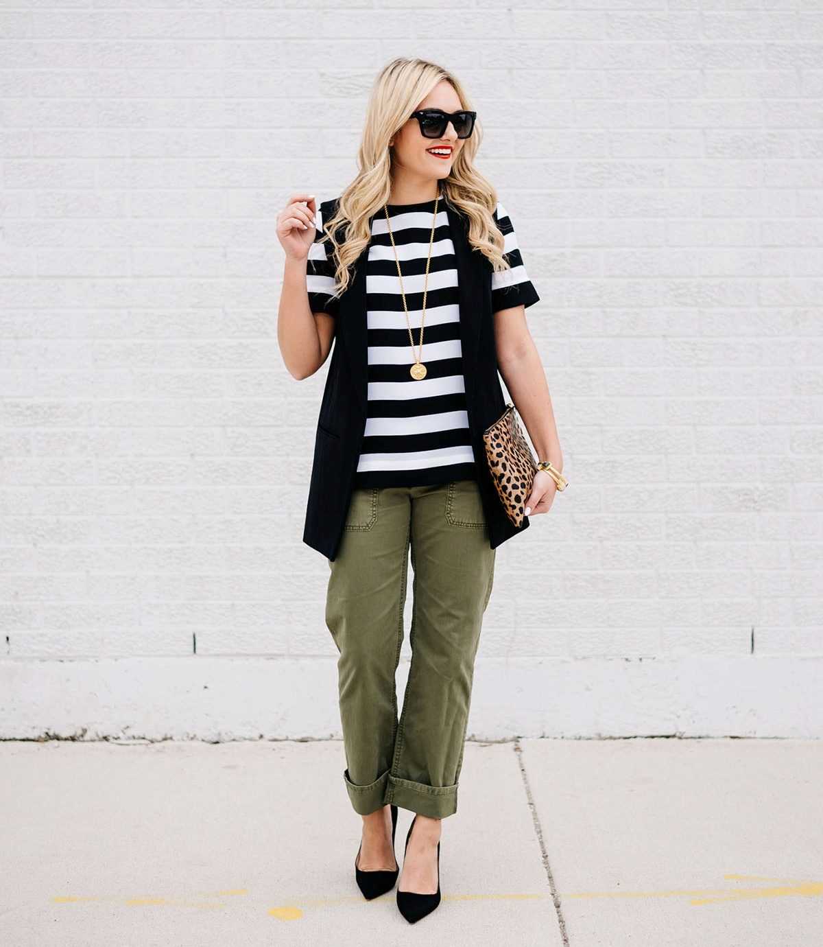 Чиносы, модный пиджак и рубашка заменили офисные костюмы из плотных тканей. В летнем, осеннем и весеннем сезоне они гармонично вписались в демократичный дресс-код. Вот идеи образов на базе классических брюк: