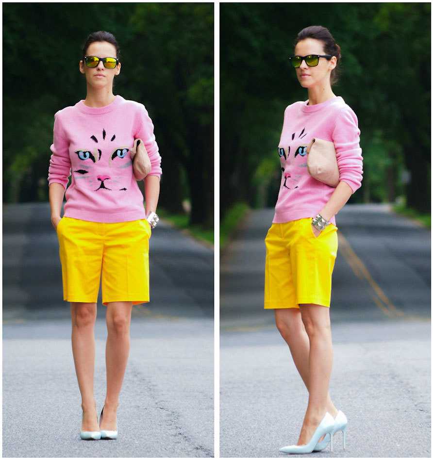 Сложнее всего составить образ с последними, они довольно сильно визуально укорачивают ноги, поэтому не подойдут невысоким девушкам. Удачно их можно комбинировать с туфлями-лодочками или ботильонами, немного обнажающими подъем. Если обувь будет светло-бежевой (в тон коже), то позволит зрительно скорректировать эффект, создаваемый длиной бермудов.