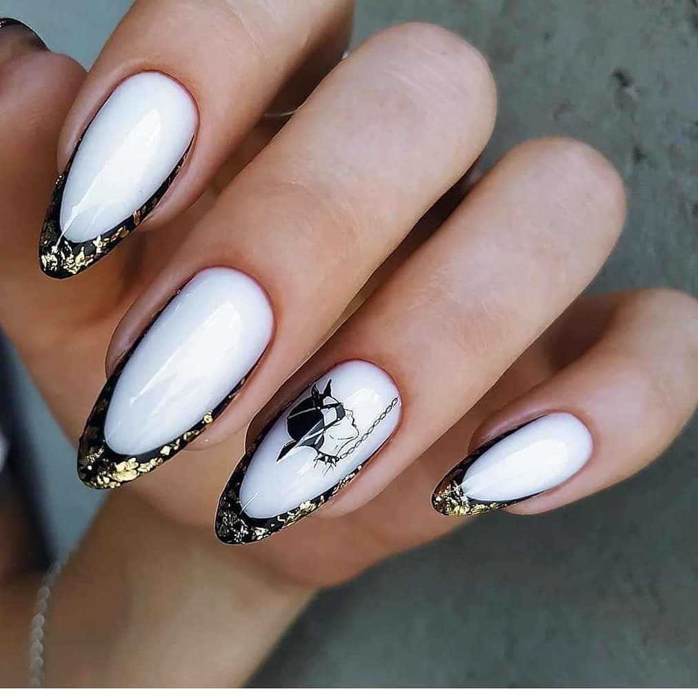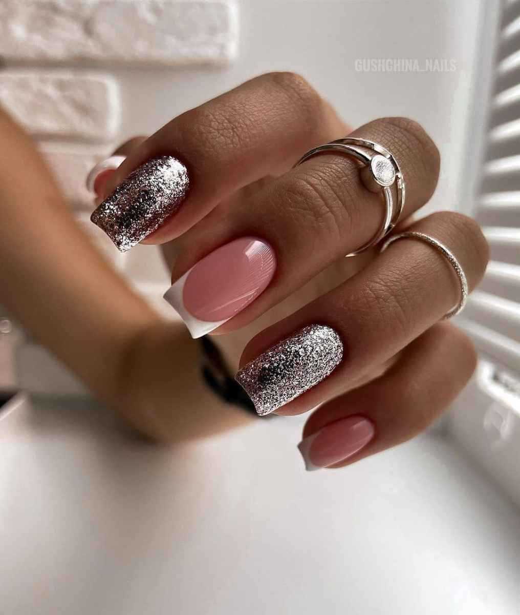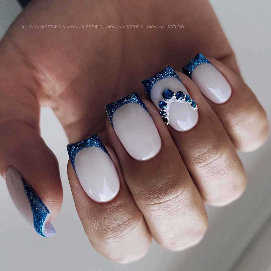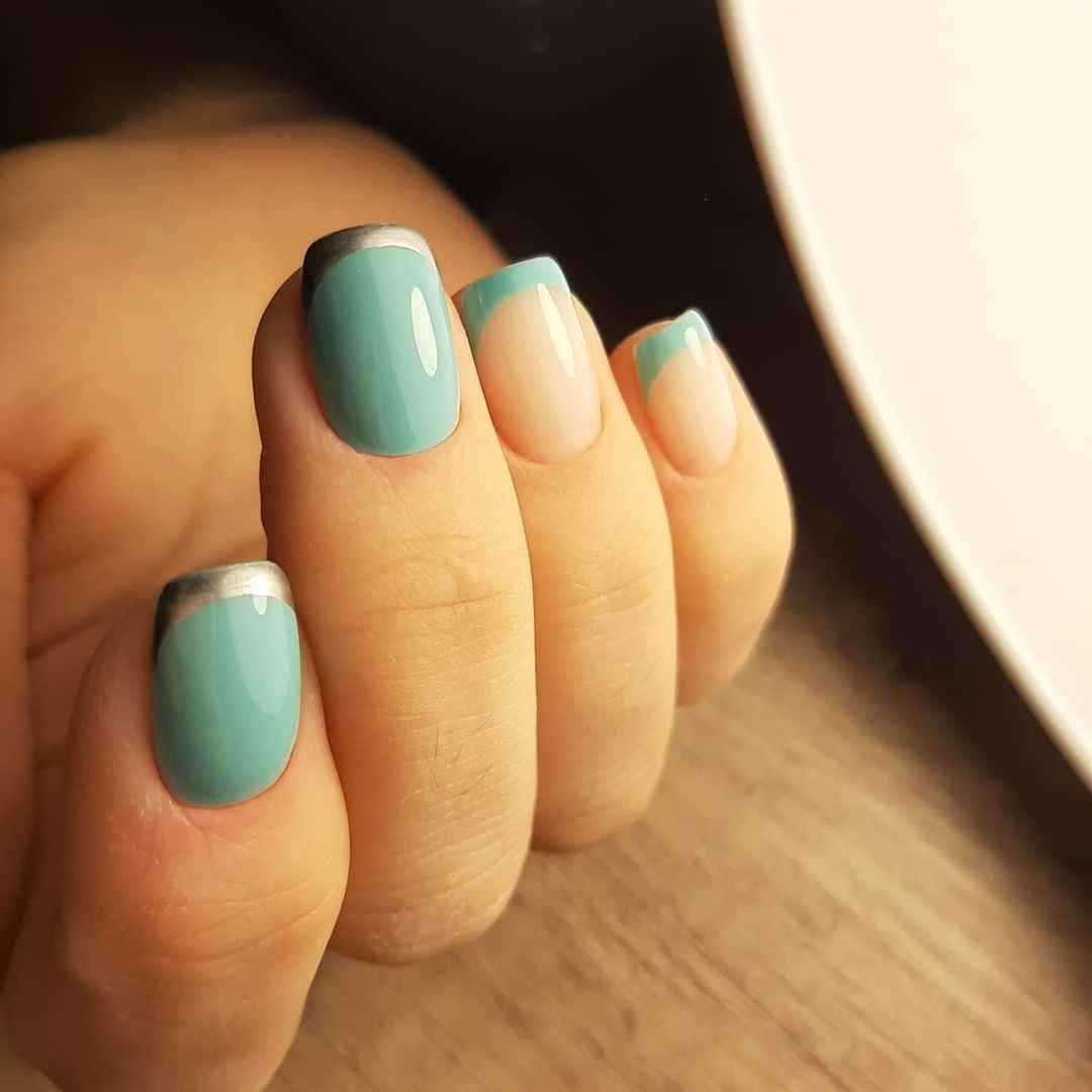 Классический французский маникюр осенью и зимой 2020-2021 представлен не только стандартным белым полумесяцем. Часто можно встретить более яркие идеи оформления кончика ногтя, например, в черных, красных, бордовых, синих, розовых, оранжевых тонах. Классический белый полумесяц чаще всего же дополняется популярными техниками. Например, френч на одном ногте, а остальные оформлены глиттером и белым лаком. На одной руке часто сочетают сразу два цвета френча, к примеру, черный и белый, серебряный и голубой и так далее. Эксперименты просто бесконечны.